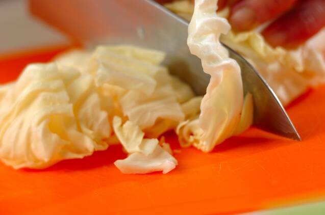 キャベツは芯と葉に分け、芯はそぎ切りにし、葉はザク切りにし、塩をもみ込んで10分程置き、水気を絞る。