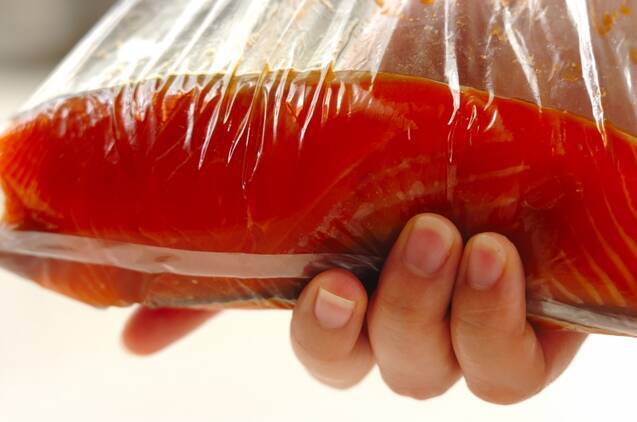 抗菌袋に生鮭、酒、しょうゆを入れて軽くもみ込み、口を閉じて10分程置く。貝われ菜は根元を切り落とし、長さを2等分に切る。