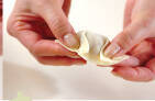<タネ>の材料を粘りがでるまでよく混ぜ合わせる。餃子の皮に<タネ>を大さじ1位のせ、皮のフチに水をグルッと薄くぬり、ひだを取りながら包む。