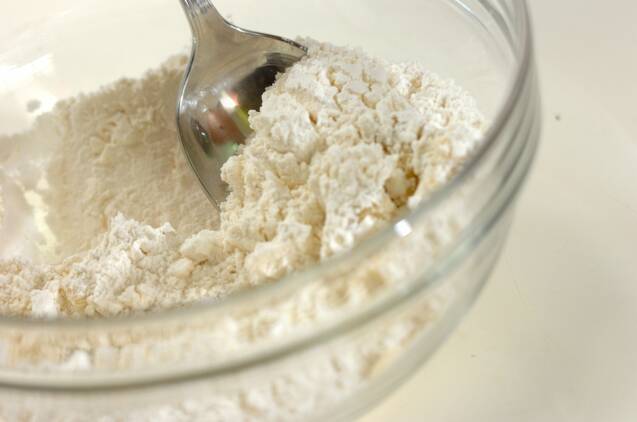 <ピザ生地>を作る。ボウルに強力粉を入れ、真ん中にくぼみを作り、塩とオリーブ油を入れ、スプーンで混ぜ合わせる。
