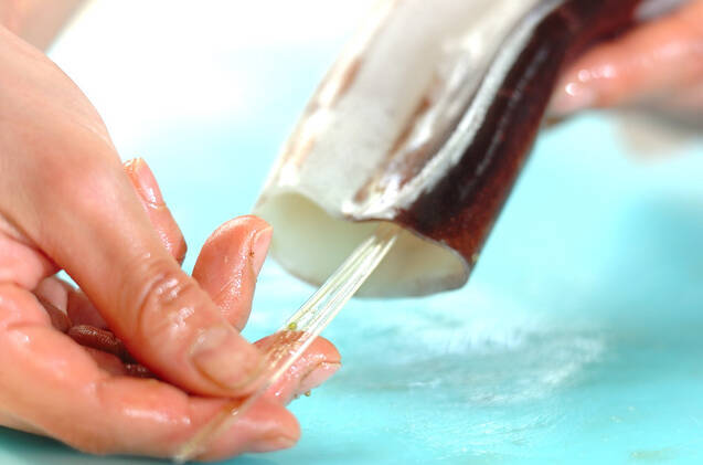 イカは胴と足がくっついている所を指で引っ張ってはずし、足を持って胴から引き抜く。胴は水洗いして軟骨を抜き取り水洗いする。足は目の際で切り落としてくちばしを取る。足先を切り揃えて吸盤を包丁でこそげ落とし、足は粗みじん切りにする。