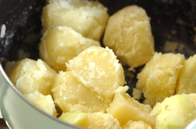 鍋にジャガイモとかぶる位の水を加え、強火にかける。煮たったらジャガイモが柔らかくなるまで約10分煮る。ゆで汁を捨てて強火にかけ、鍋を揺すりながら水分を飛ばす。