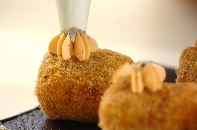 器に(3)を盛り、<合わせチーズ>を桜の花びらに絞り出し、丸くくり抜いたピクルスを中央にのせる。