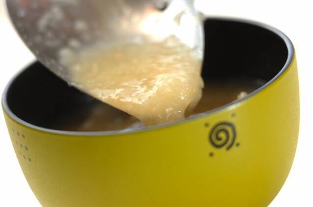 シメジに火が通ったらみそを溶き、器に注ぐ。