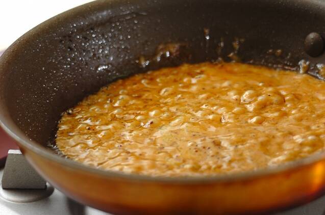 (1)のフライパンに<マヨソース>の材料を入れ、弱火にかけ、ひと煮たちさせる。