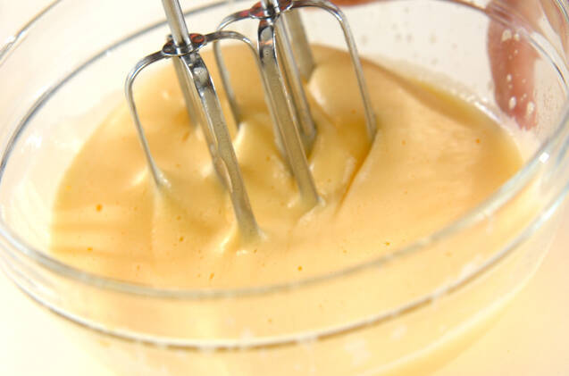 ボウルに卵を溶きほぐして砂糖を加え、白っぽくなるまでハンドミキサー、または泡立て器で混ぜ合わせる。少しトロミがついてきたら、ハチミツ、水あめ、水を加えてさらに混ぜ合わせる。