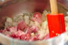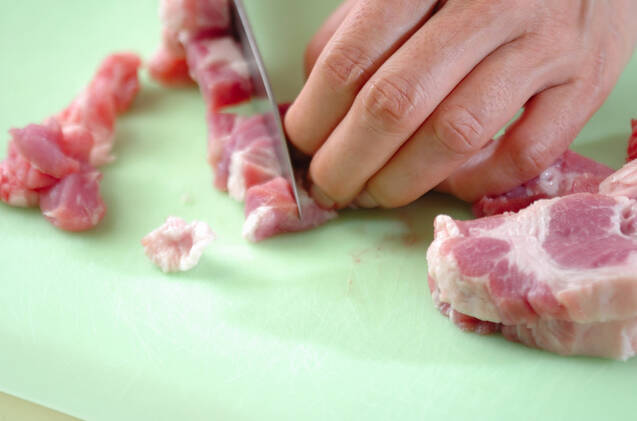 豚肉は1cm角位に切る。玉ネギは粗めのみじん切りにする。水煮豆、水煮コーンはザルに上げ、汁気をきる。
