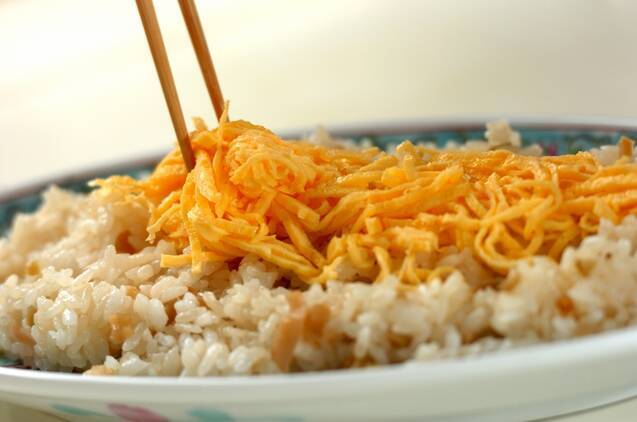 器に(1)を盛り、<錦糸卵>、ホタテを散らし、すり白ゴマを振る。お好みで<ショウガじょうゆ>を添える。