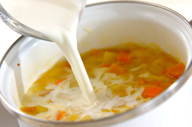 鍋にバターを中火で熱して玉ネギを炒め、しんなりしたら、カボチャ、ニンジン、サツマイモ、顆粒スープの素、水を加える。煮立ったらアクを取り、鍋の蓋をしてカボチャが柔らかくなるまで7~8分煮て牛乳を加え、さらに4~5分煮る。