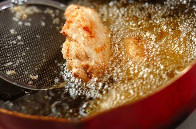 鶏手羽中に片栗粉をまぶし、180℃の揚げ油に入れてカラリと揚げる。油をきって器に盛り、ブロッコリーを添える。