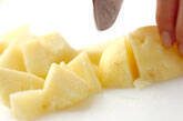 ジャガイモは皮ごと水洗いし、ぬれたままラップで包んで電子レンジで7~8分加熱し(途中で向きを変えて下さい)、皮をむいてザク切りにする。電子レンジは600Wを使用しています。玉ネギは縦薄切りにする。ベーコンは細切りにする。ベビーリーフは水洗いし、水気をきって冷やしておく。