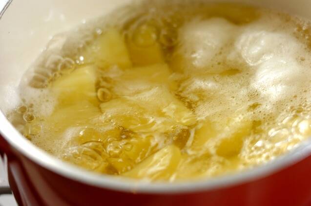 鍋にジャガイモと分量外の水をヒタヒタまで加えて中火にかける。そのまま柔らかくなるまで10~12分ゆでる(竹串がスッと刺さったらOK)。