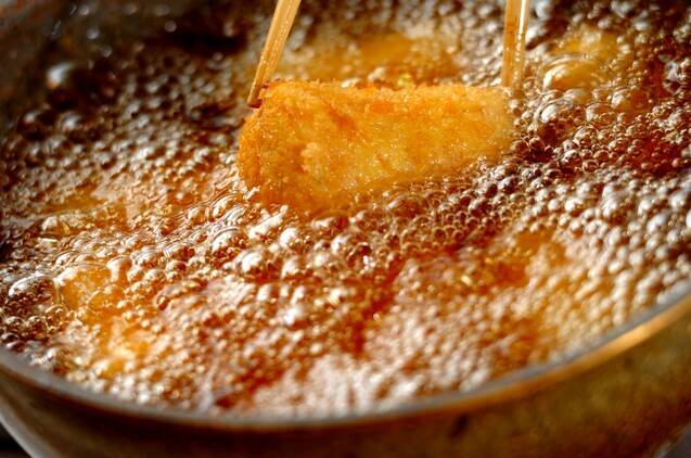 <衣>の小麦粉、溶き卵、パン粉を順につけ、170℃の揚げ油でキツネ色になるまで揚げる。器にキャベツ、プチトマト、レモンと共に盛り合わせる。