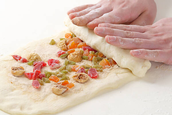閉じ目を下にして、打ち粉をからめた麺棒で少しずつ、短い辺が18cm幅くらいの長方形にのばし、全体にメープルシュガーを振り、カットドライフルーツを散りばめて手前からクルクル巻き、巻き終わりをつまんで閉じる。