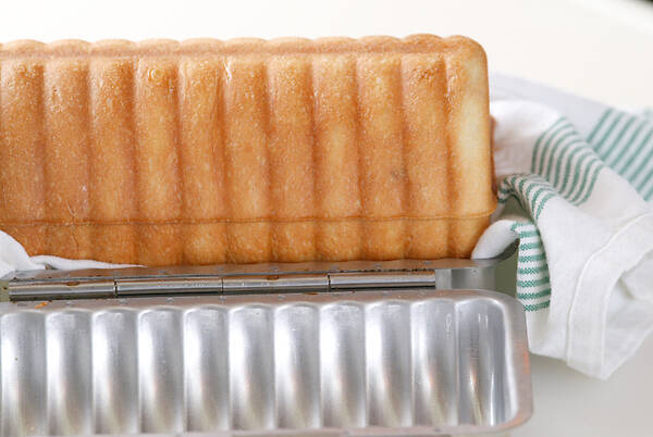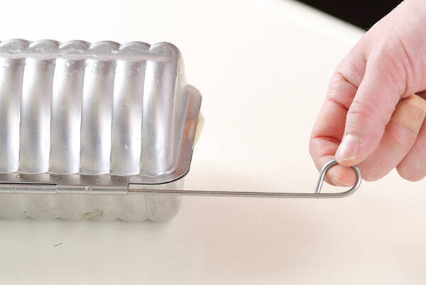 バーを差し込んでとよ型が開かないようにして、オーブンに入れ焼く。焼き上がったらすぐに型を台にトンと落として衝撃を与え、型に乾いた布を敷き、型に入れたまま冷ます。※すぐに食べないときは、ビニール袋に入れて保存します。