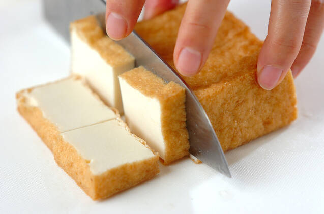 厚揚げは熱湯をかけて油抜きをし、縦半分に切ってさらに幅1cmに切る。