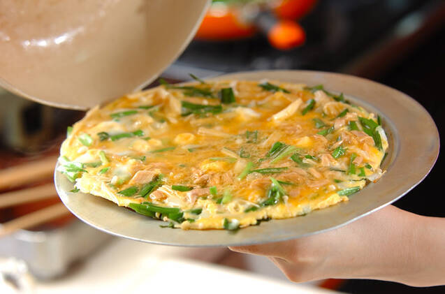 (1)にツナ入り卵液を一気に加え、周りがかたまってきたらひっくり返し、強めの弱火にする。(ヒント)フライパンの蓋などを使うと、ひっくり返しやすいですよ。