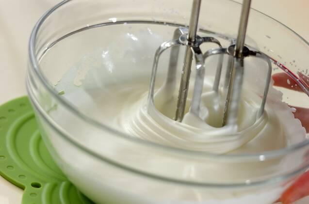 卵白を中速で1分程泡立て、砂糖を3回に分けて加える。その都度中速で泡立て、角が立ったら低速でキメを整える(メレンゲ)。