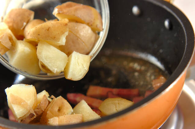 フライパンに分量外のオリーブ油を熱し、ベーコンを炒める。脂が出てきたらジャガイモを加え、塩、粗びき黒コショウで味を調え、粗熱を取る。
