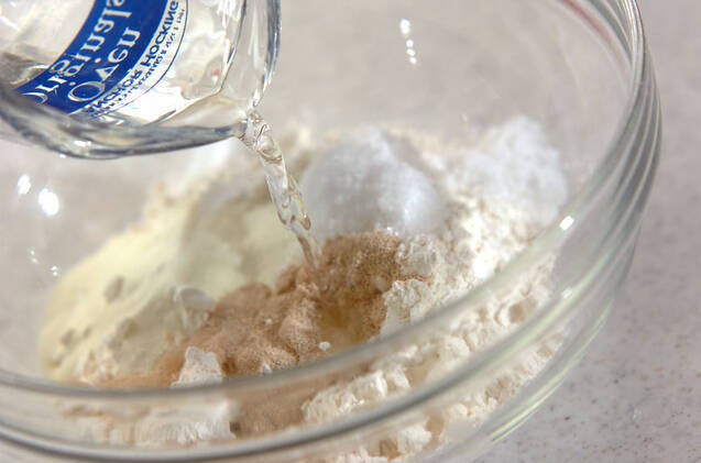 ボウルにフランスパン専用粉、スキムミルクを入れ、インスタントドライイースト、砂糖を真ん中におく。塩をはしにおき、水をかけ、カードでひとまとまりになるまで混ぜる。