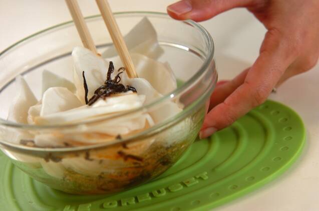 塩昆布にしょうゆ、ゴマ油を混ぜ、(1)と和える。