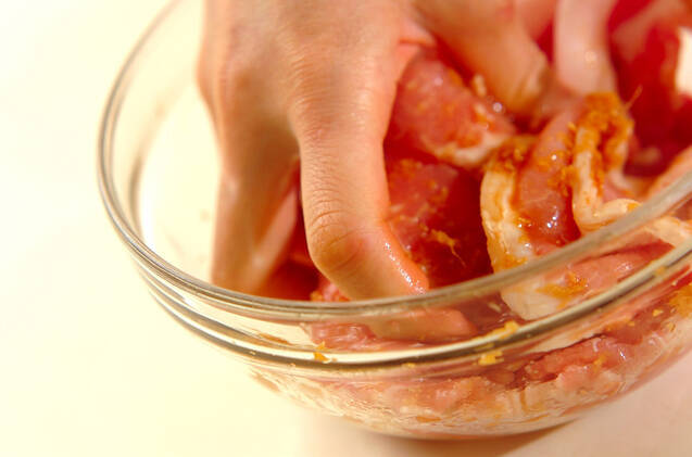 豚肉は<下味>の材料をもみ込んで10分おく。キャベツはせん切りにして水に放ち、パリッとしたらザルに上げて水気をきる。プチトマトはヘタを取ってきれいに洗う。
