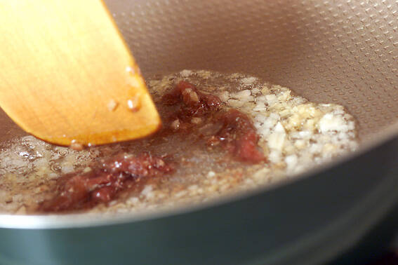 フライパンにサラダ油、みじん切にしたニンニクとショウガを入れて中火にかけ、香りが立ってきたらアンチョビを加え、木べらで崩しながら炒める。