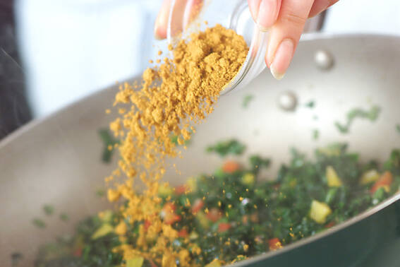 カレー粉を加え、全体にからまったら火を止める。ご飯をよそった器に盛り、乾煎りしたカシューナッツを散らす。