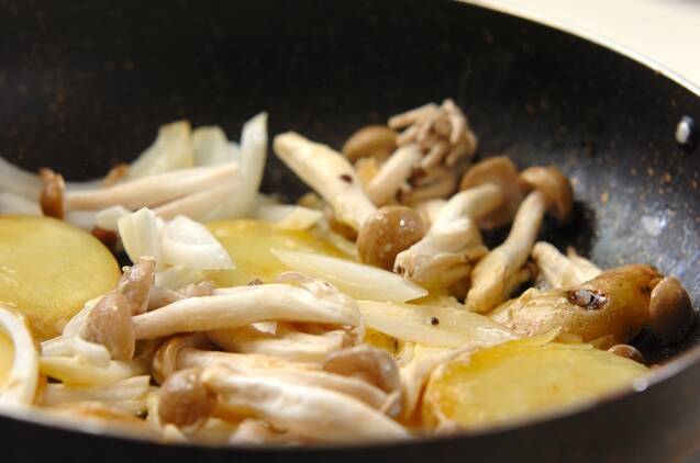 フライパンにマヨネーズを入れ、ジャガイモ、玉ネギ、シメジを入れ、中火にかける。