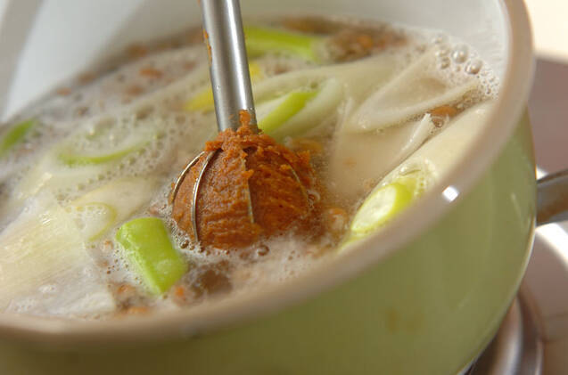 白ネギを加え、再び煮たったら火を弱める。みそを溶き入れて火を止め、最後に大葉を加えてひと混ぜし、器に注ぐ。