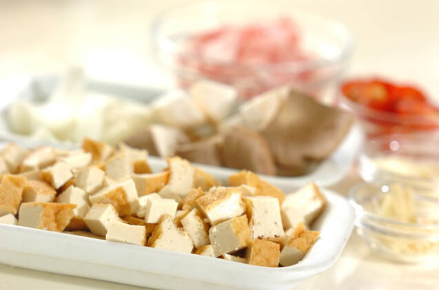 厚揚げは熱湯をかけて油を抜き、キッチンペーパー等で水気を拭き取り、1cm角に切る。