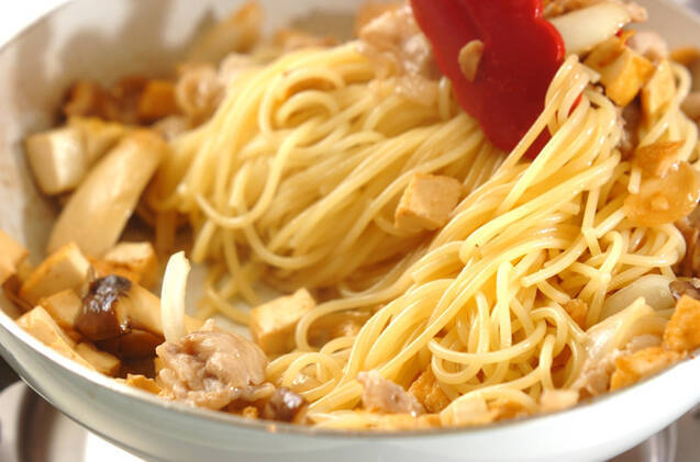<調味料>の材料を加えて、煮汁が半量になるまで煮詰める。(1)のゆでたスパゲティーを加え強火で30~40秒炒め合わせる。