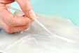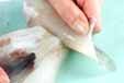 スルメイカは足を持って胴から引き抜く。胴は開いて軟骨を取り、エンペラをはずし、きれいに水洗いする。皮側に浅く斜め格子に切り込みを入れ、食べやすい大きさに切る。足はワタの部分を目の際から切り落とし、足は4cm位に切り揃え2本づつに切り離す。
