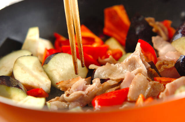 フライパンにサラダ油を熱して、豚バラ肉とナス、赤ピーマンを炒める。
