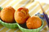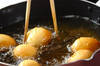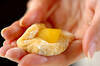 <生地>を作る。ボウルに卵を溶きほぐしてホットケーキミックス、塩を加え、牛乳を少しずつ加えて手でまとまるくらいの固さまでよく混ぜ合わせる。固さは牛乳で調節して下さい。<生地>を8等分し、栗を芯にして包み込む。
