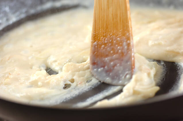 牛乳を加えて中火にし、トロミがつくまで煮詰める。顆粒スープの素、塩コショウで味を調える。