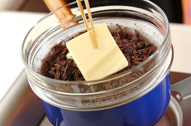 ボウルにチョコレートと無塩バターを入れ、湯煎で溶かす。
