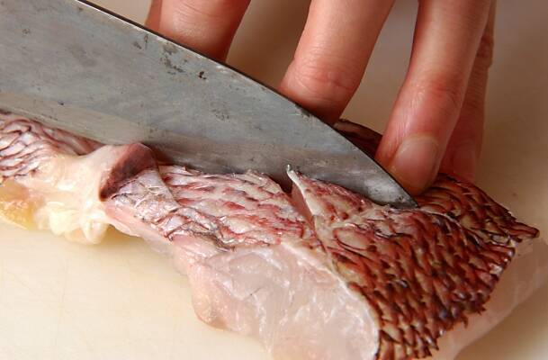 タイ切り身は身の厚い部分に、切り込みを入れる。
