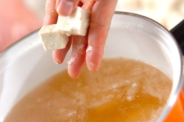 鍋にだし汁を入れて強火にかけ、煮たったら<調味料>の材料、木綿豆腐を加える。