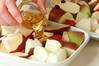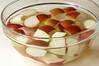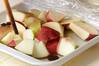 サツマイモは皮ごときれいに水洗いし、一口大の乱切りにし、塩少々を入れた水に放つ
