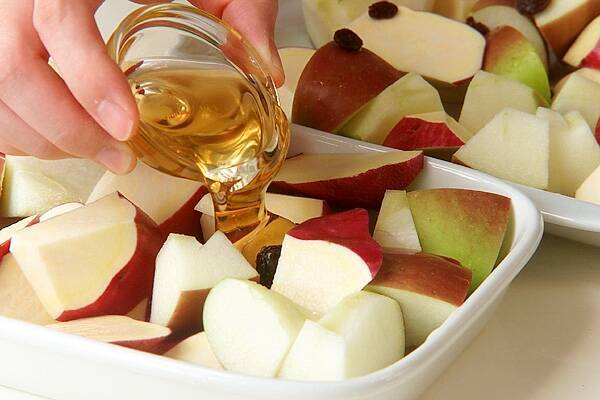耐熱皿に水気を切ったサツマイモ、リンゴ、レーズンを並べ入れ、ラム酒、ハチミツをかけ、ラップをして4分電子レンジの強で加熱する。