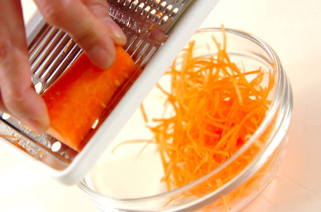 ニンジンは皮をむき、長さ4cmのせん切りにする。(ヒント)せん切りにできるスライサー等を使えば、簡単にせん切りができますね。