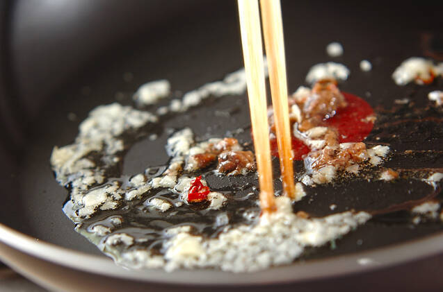 フライパンにオリーブ油とニンニクを入れて弱火にかけ、香りがたったらアンチョビと赤唐辛子を加え炒める。