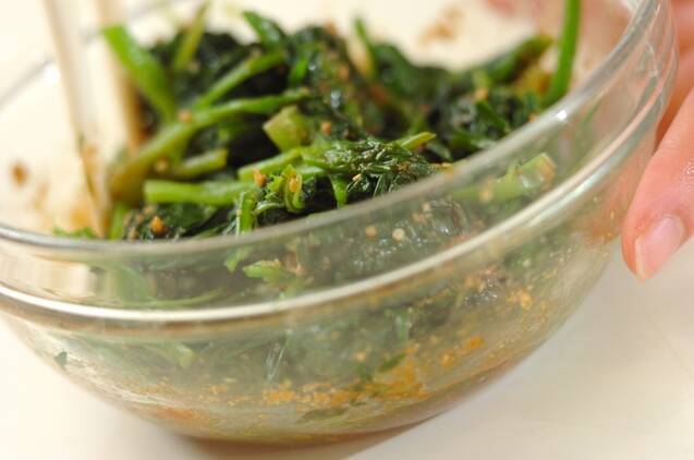 根元のかたい部分を切り落として長さ3cmに切る。根元の部分は切り込みを入れて2~4等分に裂く。<和え衣>で和え、器に盛る。