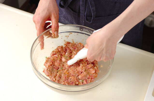 <種>を作る。ボウルにラム肉、豚ひき肉を入れて粘りが出るまでよく混ぜ合わせ、玉ネギ、ショウガ、ニンニクを加え更によく混ぜ合わせる。更にラード、サラダ油以外の材料を混ぜ合わせ、最後にラード、サラダ油を加えよく混ぜ合わせる。種を2つに分けて片方にカレー粉を混ぜ合わせ、それぞれラップを掛け冷蔵庫に入れておく。