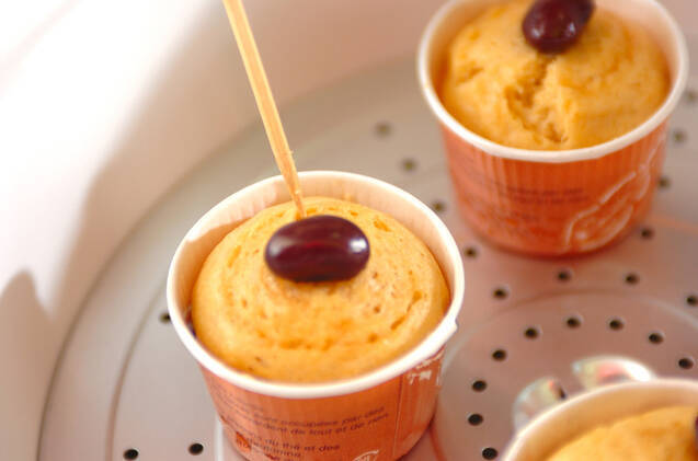 (3)に黒豆を加えて混ぜ合わせ、カップに入れてあれば分量外の黒豆をのせる。湯気の上がった蒸し器に入れ、強火で15~20分蒸す。竹串を刺し、何もついてこなければ蒸し上がりです。