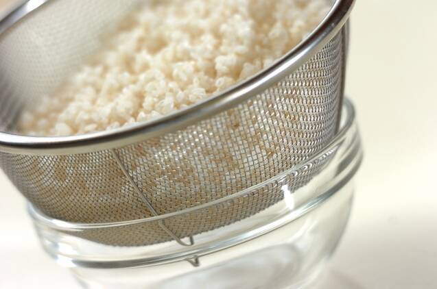 お米は洗い、水に漬けて30分置いた後、ザルに上げて水気をきる。