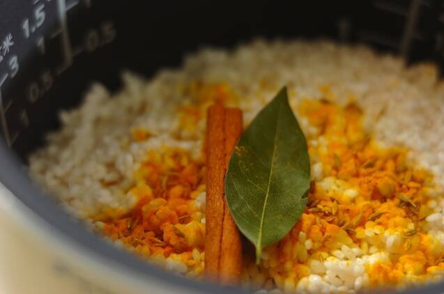 炊飯器にお米と<スパイス>の材料を加え、2合の目盛りまで水を加えてひと混ぜし、炊飯する。