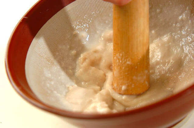 (1)のだし汁を少量、酒粕に加えてふやかし、ダマが残らないようにすり鉢ですって、ペースト状にする。