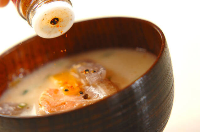 刻みネギを加えてひと混ぜし、薄口しょうゆで味を調えて器によそう。お好みで七味唐辛子を振る。